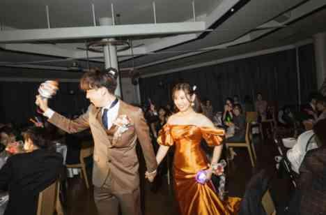 会場内は真っ暗でまるでライブが始まる様! おふたりのオープニングムービーが上映スタート。 ペンライトを光らせて、会場内の温度は最高潮!再入場はなんとテラスから! 巨大クラッカーを持って登場し、迫力のある演出に大盛り上がり! ここから後半戦スタートです! ご友人からは音楽の余興が。おふたりも参加し実際にライブ♪ テーマとバッチリな進行でゲストの皆様とともにスタッフまで楽しみました。