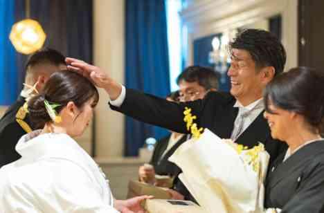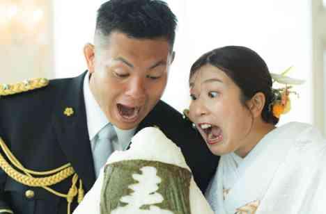 ウェディングケーキの代わりにおふたりが選んだのはBIGおにぎり! のりに【寿】が浮かぶお祝い事にぴったりなおにぎりです。 おふたり同時にかぶりつくシーンが可愛すぎる! ファーストバイトセレモニーのお次にはご両家のお母様にご登場いただき、おにぎりを握り食べさせていただくラストバイトのセレモニー!