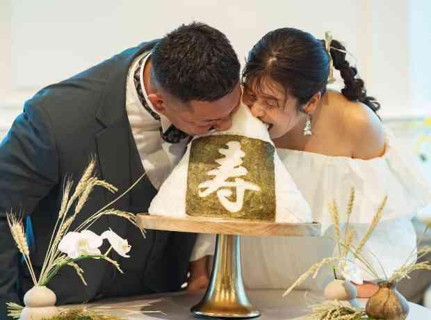 ウェディングケーキの代わりにおふたりが選んだのはBIGおにぎり! のりに【寿】が浮かぶお祝い事にぴったりなおにぎりです。 おふたり同時にかぶりつくシーンが可愛すぎる! ファーストバイトセレモニーのお次にはご両家のお母様にご登場いただき、おにぎりを握り食べさせていただくラストバイトのセレモニー!