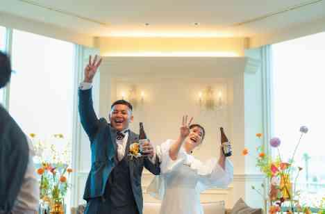 新婦お父様による乾杯の挨拶は 皆様ご存知、オリオンビールをお配りしみんなで合唱「ありっ!乾杯!」 会場内みんなで踊りながら披露宴がスタートしました★ 後半はテーブル対抗「早食い競争」 ①プッチンプリン②ゆで卵③ソイジョイ④プロテイン おふたりとお打合せで決定したこのラインナップで競争。全員で楽しんだお時間。 チームの結束力も高まり会場内も大盛り上がりとなりました!
