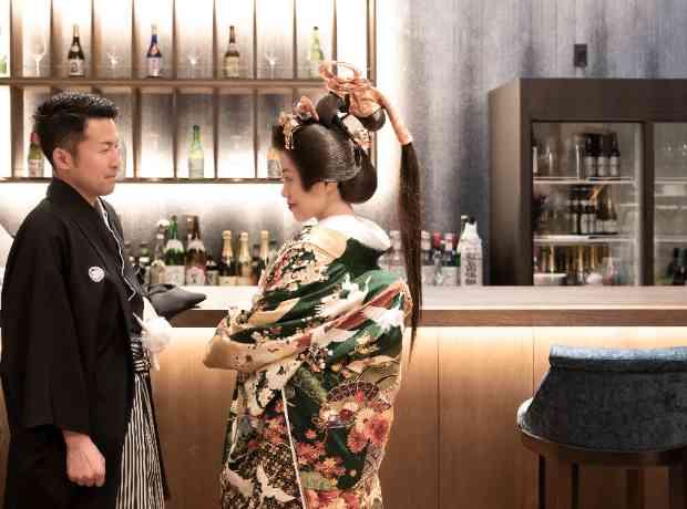 パーティ会場はとことん和の雰囲気にこだわって、ウェルカムスペースや竹を使った装花など、細部までしっかりコーディネートされた空間に。そして馬場本店酒造の江戸時代から続く最上白味醂を使用した味醂カクテルと、佐原の偉人 伊能忠敬が愛したお茶でおもてなし。お色直しでは色打掛にお召し替えされ、文金高島田に尾長をつけて華やかな和の装いでご登場されました。