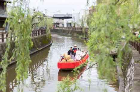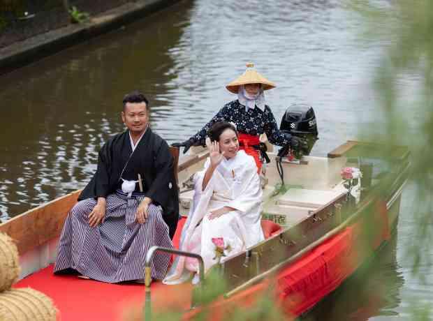 国を越えたご縁を大切にしたいという想いから、日本とタイ、それぞれの国旗バッジをご用意され、ゲストの皆様に身につけていただいた状態で挙式がスタートしました。 そして、おふたりが楽しみにされていた 佐原の花嫁舟。前日から天候が心配されていましたが、まるで祝福するかのように 昼前には雨がやみ、無事に実施することができました。