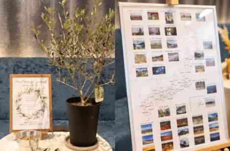 ウェルカムスペースには、オリーブの樹を用意されました。 受付を済ませたゲストがご歓談を愉しまれながら、一人ひとりがスコップで土をかけてオリーブの植木を創り上げます。 披露宴では、おふたりが仕上げとして土を入れ、水を注いで完成させました。 “平和”と“繁栄”の象徴であるオリーブの植木を全員で完成させたその演出は、参列したすべての人の記憶に残る温かなひとときとなりました。