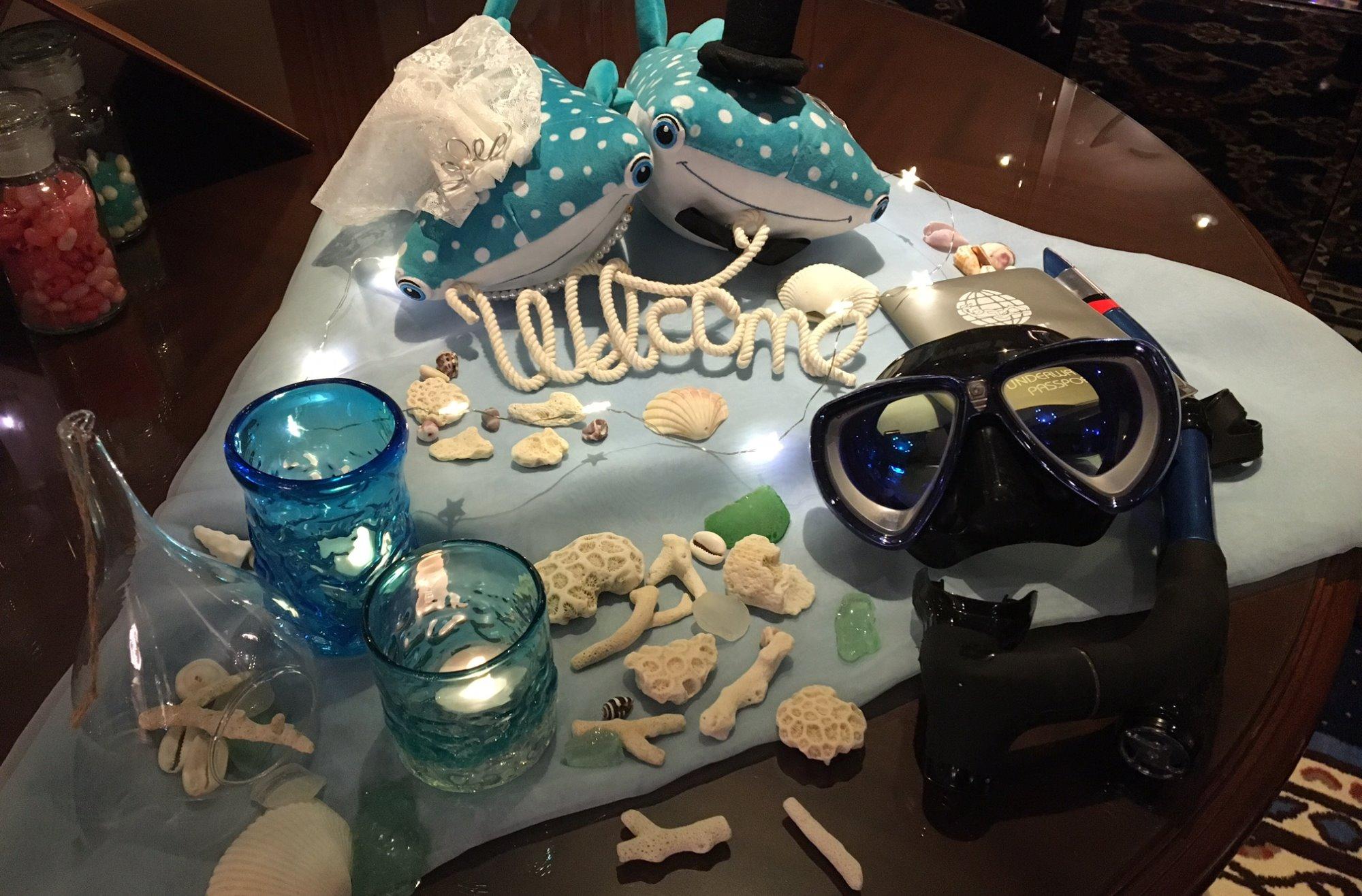 ご両人様は同じご職業で、趣味も豊富ということで、様々な関連グッズをお持込いただき、受付周りや会場を装飾いたしました。ご参列の皆様に待ち時間もお楽しみいただけるようにということで、特製のメッセージツリーもご用意いただき、ゲスト一人ひとりからお祝いのメッセージを書いていただくこともできました。