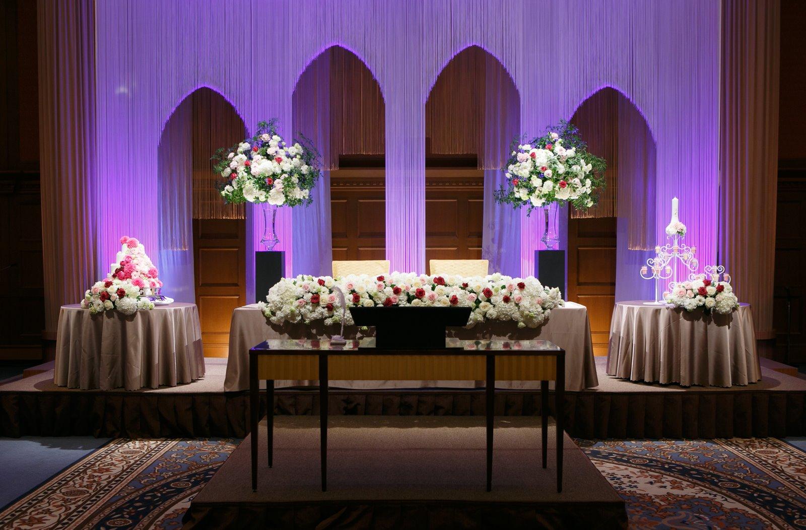 「約130名のゲスト全員に挙式からご参列いただきたい」そんなお二人の思いは、私どもの【大聖堂スタイル】という、挙式とご披露宴を同一の会場で行う形式を用いれば、叶えられます。、「ゲストにより近い場所で人前式を執り行う」というご希望もあり、挙式中は高砂よりも前に祭壇を設け、ゲストに囲まれているような印象の中、誓いの言葉も読み上げていただきました。