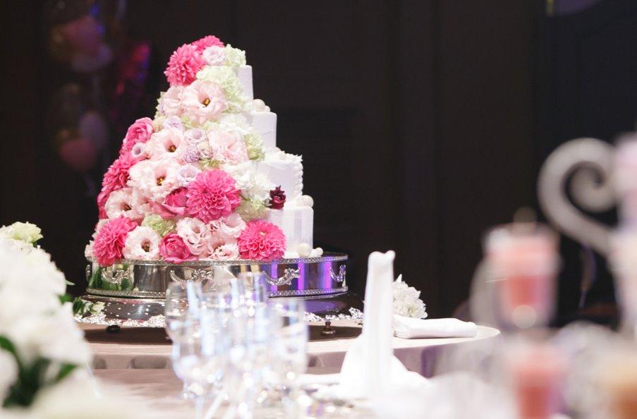 こちらは御新婦様の打合せ始まって以来のご希望でございました。調理スタッフやお花屋さんにも協力いただき、ケーキのほぼ半分は生花に包まれているような、どの角度からみても美しいウエディングケーキとなりました。