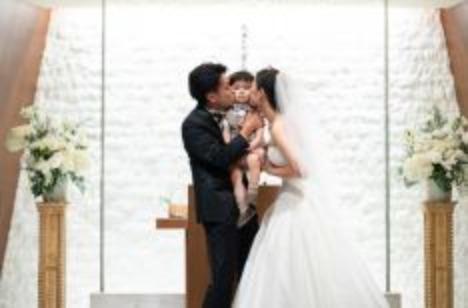 指輪の交換に続き、大切な誓いの瞬間にも、おふたりのお子様も一緒に参加。まだまだ少し緊張した様子で小さな手を引かれ歩く姿に、チャペル全体が優しさと笑顔に包まれました。大好きなパパママからの誓いのキスのシーンは家族の絆を感じられ、ゲストの方にもチャペル全体にも温もりあふれるオリジナルセレモニーになりました。