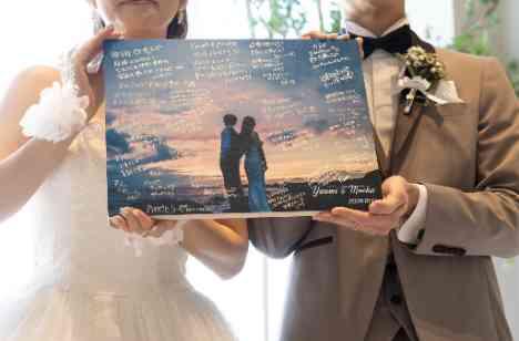 ゲストに見守られながら人前式をおこないました。 ウェルカムスペースではフォトボードを飾り、ゲストの皆様にメッセージを書いていただきました。世界に一つだけのオリジナルフォトボードが出来上がり、挙式中にゲストの皆様にお披露目をされたおふたりでした。結婚式後もご自宅に飾れる大切な記念ボードになりました!