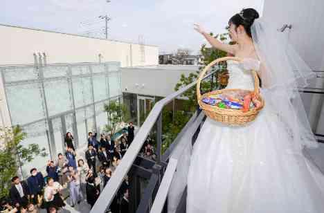 挙式の後は隣接するガーデンでアフターセレモニーをおこないました!ゲストに囲まれて大階段でのフラワーシャワーの後は新婦様のご実家が駄菓子屋さんのため新婦様念願のお菓子まきをしました!上から飛んでくるお菓子に「すごーい!」との大歓声が☆おふたりもゲストも大盛り上がり!笑顔溢れるアフターセレモニーになりました。