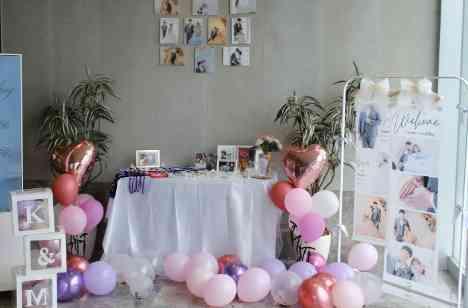 ウェルカムスペースは、おふたりの前撮り写真で作った存在感のあるタペストリーをメインに、壁にはフォトパネルを貼って、さらにパステルカラーのバルーンを散りばめ、可愛いをぎゅっとつめこんだオリジナルの空間を作りあげました♡ ゲストの方々も「可愛い!」と言いながらたくさんお写真を撮っていらっしゃいました!