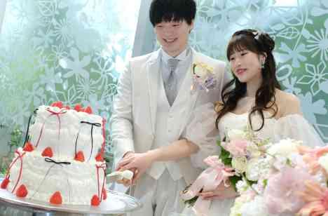 ウエディングケーキはオリジナルで可愛く作りました!クリームの絞り方にこだわり、お手製の赤×黒のリボンをくっつけ“映え”ケーキの完成!ケーキが会場内に運ばれてくるとゲストの方々からも歓声があがっていました! そんなこだわったウエディングケーキに笑顔で入刀をされたあとはファーストバイトをおこないました。