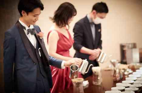 お二人からの感謝のおもてなしは“コーヒータイム”。注がれるその一杯に皆様の心もほっこり、和やかな時間が流れます。大切で大好きな人たちがコーヒーを片手に微笑んでいる光景は、お二人にとっても至福の瞬間。お二人らしい「ありがとう」のお伝えになりました。お料理にもしっかりこだわり、瞬間スモークやドライアイスの料理演出と共に、お二人の結婚式だけのオリジナルメニューとして、その特別感も楽しんでいただきました。