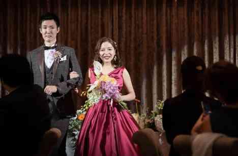 お皿の下に隠されたメッセージや料理演出など、様々なサプライズでお二人の感動を再現したパーティ。ゲストの皆様の元へ行き、写真撮影と会話をゆっくり楽しむ時間は至福の宝物です。艶美なワインレッドのカラードレスで大人雰囲気なお色直しのご入場は、ダウンヘアとランダムに華やぐブーケでパーティ感をさらにアップしてご登場。