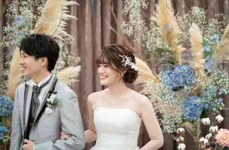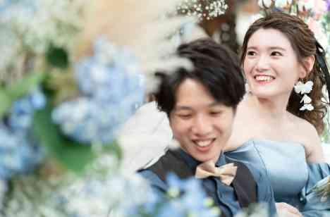 パンパスグラスのアーチは澄んだブルーの装花でスタイリッシュに、ソファサイドにはコーラルピンクのダリアがホワイト装花の中で愛らしい際立を、ふわふわした装花が交差する安らぎを感じるパーティ会場。フォトタイムは大好きな皆様と距離近く、心通わせ、華やかなフレームの中にたくさんの笑みが咲く至福のとき。色あてクイズを交えたお色直しのご入場は美しい透明感のミスティブルーのドレスが皆様の目を惹き、魅了します。