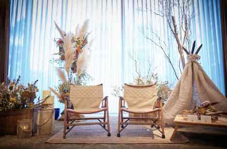 キャンプ好きのお二人の世界観を大切にしながら、ゲストの皆様へのおもてなしにもこだわったパーティは、楽しいイベントの雰囲気で会話と食を楽しむ一日に。キャンプギアやウッド調のアイテム装飾、ドライフラワーのフォトジェニックなオリジナルキャンプ空間づくりにもこだわりを。誓いのときは荘厳に、パーティは自由度高く、和洋折衷を織り交ぜたお二人の結婚式をご紹介します。