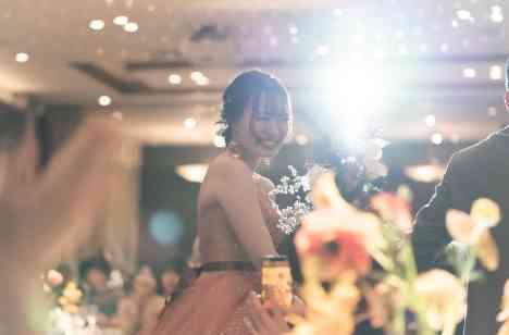 イエロー・テラコッタ・グリーンの鮮やかな彩りのコーディネートは、淡いマゼンタ色の胡蝶蘭で上品な雰囲気もプラス。フォトタイムと会話をゆっくり楽しむ貸切パーティ。大好きな皆様と過ごす時間は最高に楽しくて、とても嬉しくて、至福の幸せがどんどんあふれます。シャンパンゴールドの会場にお似合いのテラコッタドレスは、グリッター刺繍の美しい輝きを放ちながら華やかにご入場。
