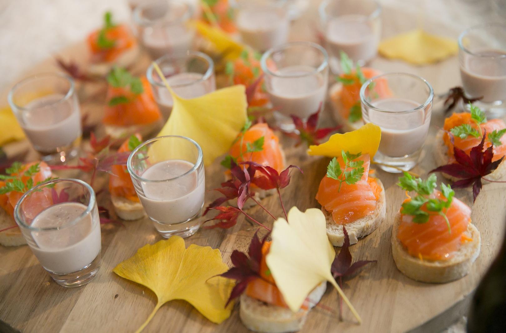 お待合いにご用意したのはウエルカムビュッフェ!お2人のおもてなしのお気持ちから決まったそう!待合いのお時間からゲストの皆様はお酒も楽しんでゆったりと過ごされました。