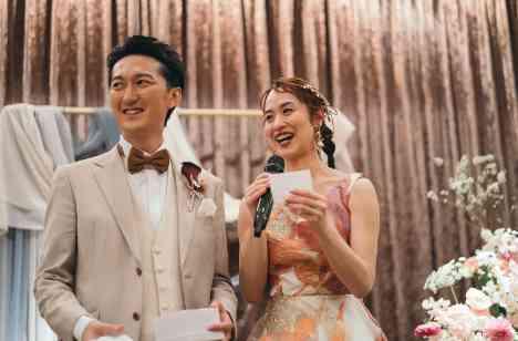 ビジュー輝くシアーブラウスのドレスチェンジで、華やかにご入場。スピーチやインタビューなどゲストの皆様からお話いただくこれまでの日々の思い出に、たくさんの笑みがこぼれます。パーティ会場に現れたたくさんの恐竜は新郎ご友人によるユーモアあふれる祝福。声高々に全員で大盛り上がり。おひとりおひとりとの時間も大切に、歓談とフォトタイムの中で交わす言葉も光景もすべてが特別な瞬間となる素敵な時間を過ごされました。