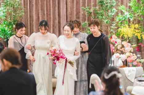 愛息子様の可愛い乾杯のご発声から、ウェディングパーティがスタート。中座では懐かしい時が巡るように、新婦様は学生時代に先生が命名された仲良し5人組「チームファイブ」と、新郎様は小さな頃からご一緒の幼馴染と和気藹々の楽しいエスコートタイムに。ご友人夫婦へのサンクスバイトやご友人からの歌の贈り物・スピーチと、お二人との絆が一層に感じられるシーンにあたたかい笑みが広がります。
