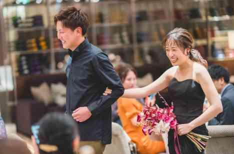 ローポニーヘア×ブラックドレスの新婦様はシャツスタイルの新郎様とスタイリッシュさの中にもラフさをプラスしたお色直しのご入場。ドレス当てクイズも交えたご入場はひときわ歓声が上がります。多彩なピンクグラデーションのソファコーディネート空間でフォトジェニックな楽しさを添えて、お二人のラフなスタイルにゲストの皆様もより自然体で「わいわい」のフレーズがお似合いの楽しい時が続きます。