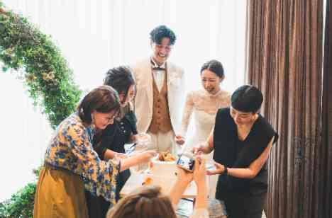 お二人厳選のコース料理と食べ比べゲームで美食を楽しくご堪能。ホワイト装花とグリーンで統一された上質なナチュラル空間でフォトジェニックな思い出作りも楽しまれます。ご家族への感謝のおもてなしとして、会場全体を見渡すことができる一段上がった「プレミアムシート」からお二人の幾重の特別な瞬間を見守っていただきました。