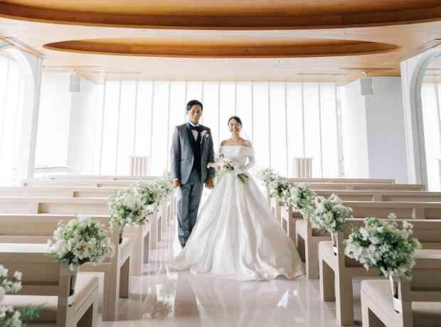 優しい光と木の温もりのなか、朗らかな笑顔でご入場される新郎様の姿はゲストの皆様の心を惹きつけて、緊張をほぐし、アットホームな挙式のはじまりへ。新婦様もそのあたたかさに包まれ、新郎様の元へと導かれます。互いを大切に想う気持ちが伝わるオリジナルの誓いのことばを交わすシーンや指輪交換の特別な瞬間をバージンロードが神秘的に映し出します。