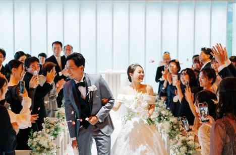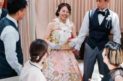 新婦様からお母様へ、スクリーンに感謝のメッセージが流れた直後、開いた扉からご登場したのは、桜が美しく舞う和装ドレスの新婦様。そのドレスはお母様の着物をアレンジしたオリエンタル和装でした。縫製や裁断は一切せずに着物がドレスへと変身する姿は、お母様との絆を感じ、愛情も咲き誇る感動的なお披露目シーンに。当日は新婦様のお誕生日でもあり、より特別な一日となりました。