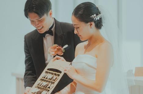 新婦お父様から新婦様を託されるとき、想いが涙となりあふれる新郎様に、ご参列された誰もがその想いを心深く感じて、託されるまでそっとあたたかく見守ります。ゲストネーム入りのウッドチャームが優しく揺れ動く結婚証明書は特別なカタチとして、これから先ずっとお二人のそばで、いつまでも色褪せない光景を映し出します。