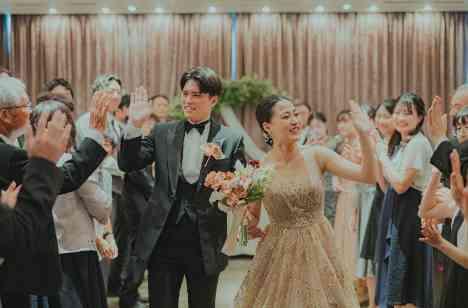 スパンコール煌くゴールドのカラードレスのお色直しは、パーティ感をアップして、パーティをさらに盛り上げます。新郎様はバスケ、新婦様はテニスとスポーツをずっとされてきたお二人はたくさんの素敵な仲間に囲まれてきました。そんなお二人らしい退場シーンとして、ご退場時は皆様がつくる花道を仲間と喜びを分かち合うように、ハイタッチをしながら笑顔いっぱいに歩まれました。