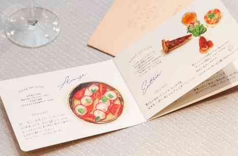 演出や物の意味を大切にしたいと考えていらっしゃるお二人は再入場の時、ゲストのテーブルもお色直しをしようとお花を飾っていきました。ただ添えるだけではなくゲストに伝えたい花言葉に合わせて飾っていきます。メニューも文字だけで伝えるのではなく、もっとワクワクしてほしいと絵本のようなメニュー表を作成。お皿に込められたエピソードはお二人の手書きでご紹介。お二人の気持ちをプラスして更に最幸のお料理に♪