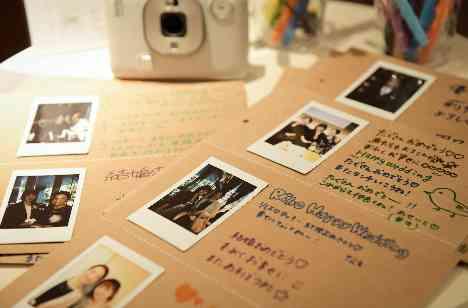 結婚式の思い出を1冊のアルバムにすることにしました。カメラマンはゲスト。チェキで自由に写真を撮っていただき、その写真にメッセージもお願いしました。「自由ににどうぞ♪」のおもてなしは盛り上がります!メッセージを貰うことが好きな新婦様、写真が趣味な新郎様、お二人の好きなことと融合させた特別な1冊。結婚式の後も振り返り、楽しめる素敵なアイテムをゲストと作ることができました!