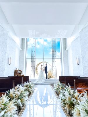 地上60m!祭壇の向こうに青空が広がる開放的な空間。柔らかな陽光が差し込み、純白のバージンロードを歩む花嫁姿を美しく照らします。