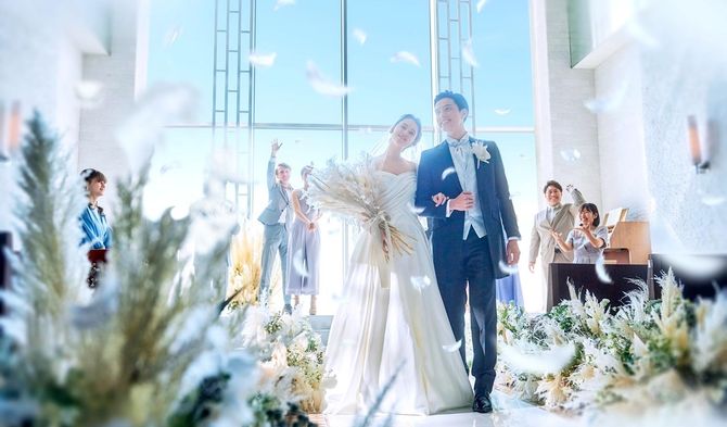 地上60m、最上階のスカイチャペルは祭壇ごしに広がる壮大な眺望が魅力。天然石で造られた純白のバージンロードには誓いの瞬間のおふたりのシルエットが美しく映し出され、ゲストからは感嘆の声があがるほど。当日さながらの感動の入場体験を♪