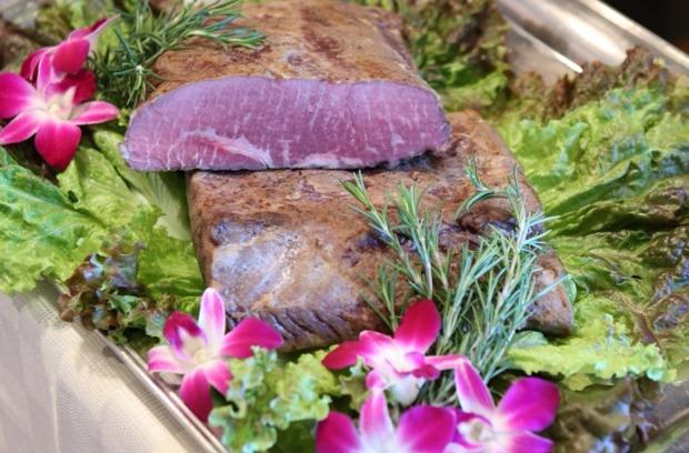 ケーキ入刀と見せかけて・・・ ラグナスイートシェフ特製のローストビーフが登場! 11月29日は良い肉の日なので こちらのローストビーフへご入刀 ゲストからも驚きと歓声が上がっていましたね!(^^)! ご新郎様へのお肉を準備しにっこり笑顔の一帆さん 謙児さんの大きな口へ愛情たっぷりのファーストバイト♡