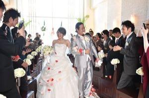 ウェディングドレスにすごく憧れがあったご新婦様。 披露宴は楽しくがテーマでしたが、挙式はしっかりとおやりになりたいとのことでいしたので、教会式で行いました。 結びの退場シーンで皆様にお祝いのフラワーシャワーを してもらうお二人がとても印象的でした♪