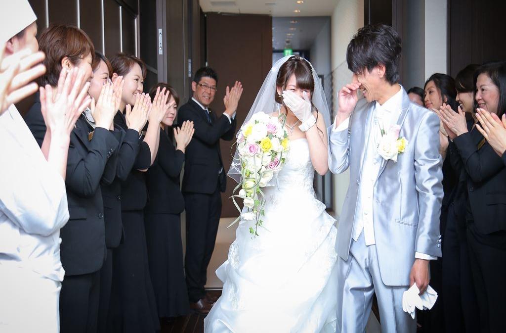 打ち合わせの時にご新婦様が唯一心配されていたポイントが4人だけじゃ少し挙式が寂しくなるのではないかというところでした。 そこでお二人のためにプランナーからゲストではなく会場スタッフがサプライズで拍手でお見送りをしようということに! チャペル退場時はスタッフの祝福の拍手に包まれながらご新婦様の驚きと喜び、そして感動の涙がとても印象的でした。
