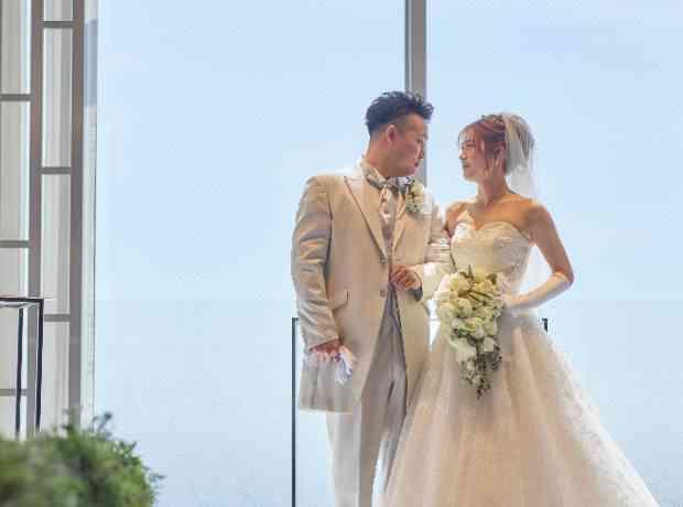 入場と同時に空一面の景色が視界に入ってくる当館のスカイチャペル。この景色を気に入ってくださったおふたりは、結婚式の当日ファストミートをチャペルにておこないました♡ 新婦様のドレス姿を当日まで楽しみにしたいと、衣装の試着のタイミングで席を外されていた新郎様。いよいよご結婚式当日。新婦様に肩を優しく叩かれて振り返ったときの新郎様の嬉しそうな表情はとても優しく、ほっとするような時間となりました♡