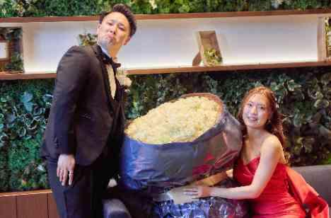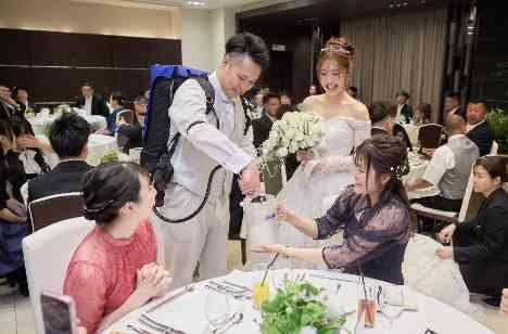 お酒が大好きだという新郎新婦様♪当館に初めて見学に来た時からビールサーバを背負って入場されることに興味があり、演出のひとつとして取り入れることを検討していました。そんなおふたりは定番のビールではなく、大好きなレモンサワーに♪またお色直しの入場で背負われるパターンが多いこの演出ですが、最初から楽しく派手にいこうということで、披露宴の最初の入場で背負い、ノリノリで登場されました!