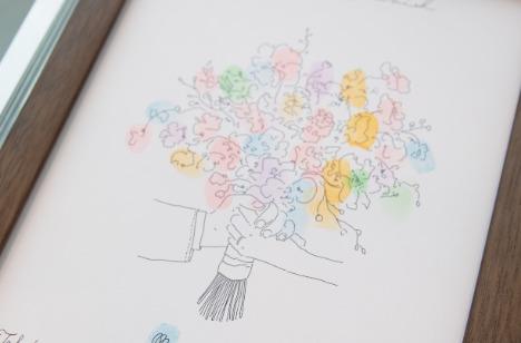 挙式の結婚証明書にご用意されたウェディングツリー。新郎新婦様の手が花束を持っているイラストに、ゲスト皆様から色とりどりの拇印を押していただきました。ご用意したのは、赤・ベージュ・黄・黄緑の四色。淡い色味に仕上がり、ナチュラルな雰囲気がお好きな新郎新婦様にぴったりなオリジナルアートが完成です。結婚式が結ばれたら自宅のインテリアとして飾っても素敵ですね♪