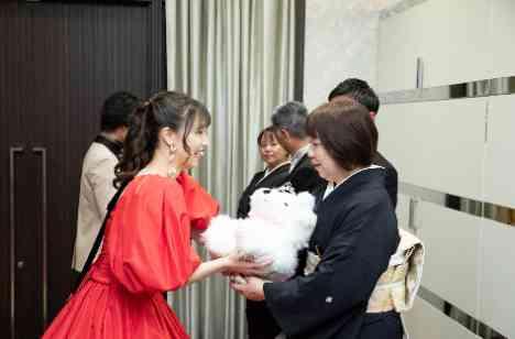 親御様に贈られた結婚式の記念品は、ウェイトベアと前撮りの写真アルバム。ウェイトベアを手にしたお母様は、そのぬいぐるみに刺繍された生まれた時の体重を見て感慨深いような表情を浮かべられました。生まれた時の体重を直に感じながら、おふたりが成長し今日という日を迎えられたことを受け止め、これからも一番近くで見守ってくださるであろう親御様との絆に、会場内は感動の雰囲気に包まれました。