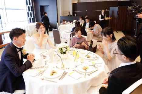 乾杯するとゲストテーブルへ移動を始めたおふたり。新郎新婦様が座る席も用意し、お越しいただいた皆様との歓談の時間を楽しまれました。新郎新婦様も一緒にお食事を召し上がりながら会話に花を咲かせ、何度も楽しそうな笑い声が沸き起こったご披露宴。近しい関係性の皆様と、少人数の結婚式だからこそのおもてなしですね♡