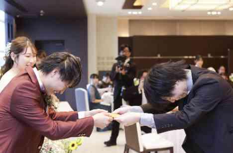 挙式では、親御様とのジャケットセレモニーやベールダウンセレモニーが結ぶと、新婦様の役目がお父様から新郎様に引き継がれる場面が来ます。お父様の優しい眼差しと、その想いを受け止める新郎様の覚悟が垣間見え、会場中がその瞬間を静かに見守りました。誓いの言葉を述べるシーンでは、涙ぐんだ様子も見られた新郎様。結婚式を迎えられた喜びと、皆様への感謝の想いが溢れ出た感動的な挙式でした。