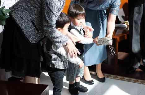 ご新婦様はエスコート役のお父様と一緒にご入場され、ゲストの方に見守られながらご入場後に入場口にてお母様によるベールダウンを行っていただきました。 その後、指輪交換時にはご新郎ご新婦様それぞれの甥っ子くんがリングボーイをとしてお席より登場し、大切な指輪をおふたりのもとへ届けてくださり、ほっこりする時間でした。