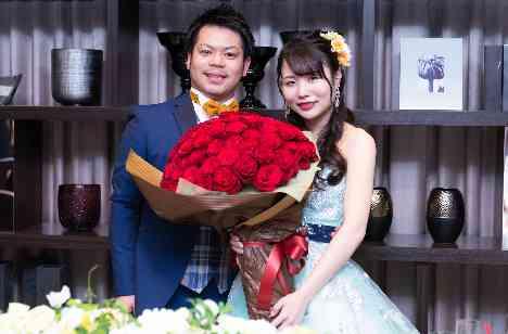 新郎様は新婦様が生まれた病院や通われた学校を訪れ、新婦様の人生を振り返られるような、素敵な映像を作成いただき、当日はサプライズDVDを上映し、【永遠の愛 ずっと一緒にいよう】という花言葉が込められている赤バラ99本の花束を新婦様へプレゼントをしていただきました。 新郎様からのサプライズには大変驚かれ、涙ぐんだご様子で喜ばれており、大変素敵なサプライズ演出でございました。