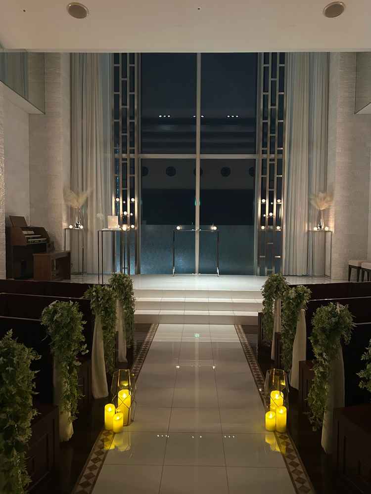 夜の挙式会場を見学したのですが、ライトアップなどもあり十分素敵でした。明るい時間帯の写真も見せてもらいましたが、反射が綺麗でとても良かったです。