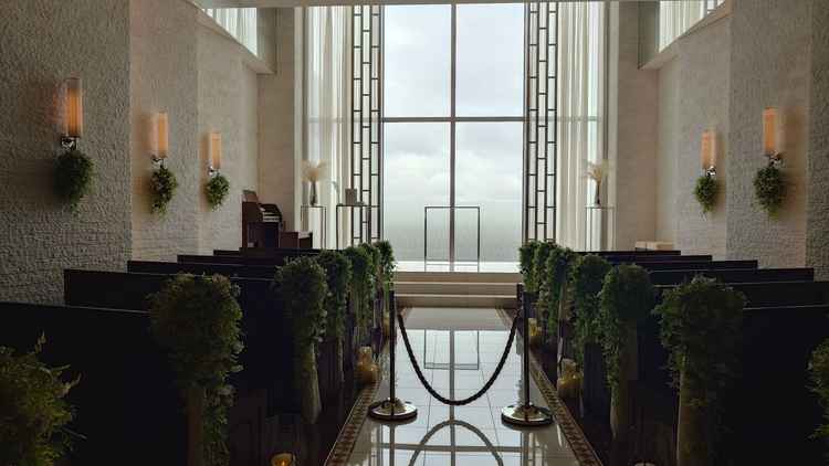 天候に左右されず、遠方のゲストも繋がれる青空が広がるスカイチャペル。