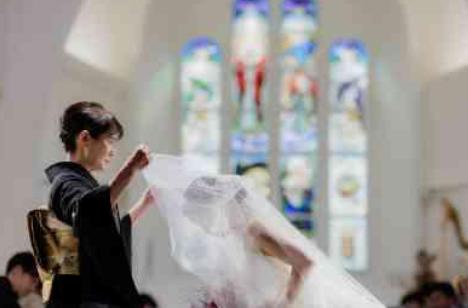 アニヴェルセル 表参道では、ステンドグラスやロイヤルブルーのバージンロード、シンプルながらも洗練された空間でゲストの皆様に挙式を見届けていただきます。ご入場時にはお母様によるベールダウンセレモニーを行ないました。ベールを下ろしながら想い出すのは、幼い頃に親御様に身支度を整えていただいた日常の日々。そんな親子のお時間を皆様に見守っていただきました。