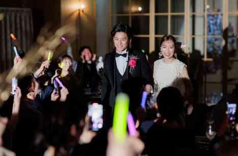 日頃よりアーティストのライブに行くのがお好きなご新婦様。「アーティストのようにペンライトでゲストに迎えてほしい!」「ライブのワクワク感を伝えたい!」とお話しされていました。ご披露宴の入場シーンでは、その憧れを叶えるべくスモークの中からご登場され、色とりどりのペンライトの光に包まれるなか、手を振りながらメインテーブルへ。想い出のアーティストの音楽が鳴り響き、ゲストの皆様もノリノリの演出でした。