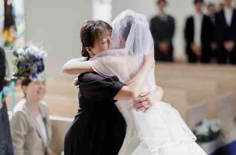 結婚式当日に新婦がウェディングドレスを身にまとい、ベールをおろすのは身支度の仕上げです。 「今までは私が一番そばで見守っていたけれど、これからは新郎さんが守ってくれるね。喜んで送り出すわね、幸せになってね」母親のそんな思いを込めて、新婦の身支度を完成させるのです。 お母さまとの抱擁はゲストの皆様の心に残る瞬間でした。