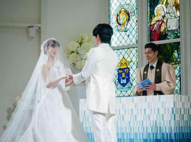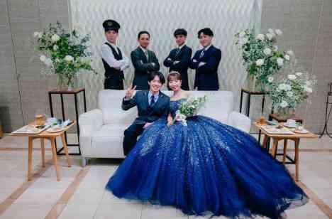 当式場の挙式には愛犬も参加することができるため、リングドッグをしたいと希望していたおふたりの決め手となりました。また、ブルーのバージンロードは、青が好きなご新郎の好みでもあったそう。 ご新婦の選んだウェディングドレスは、クラシカルでナチュラルなAラインでありながら、派手すぎず、キラキラとした素材で華やかな印象を与え、挙式会場に美しく映えていらっしゃいました。